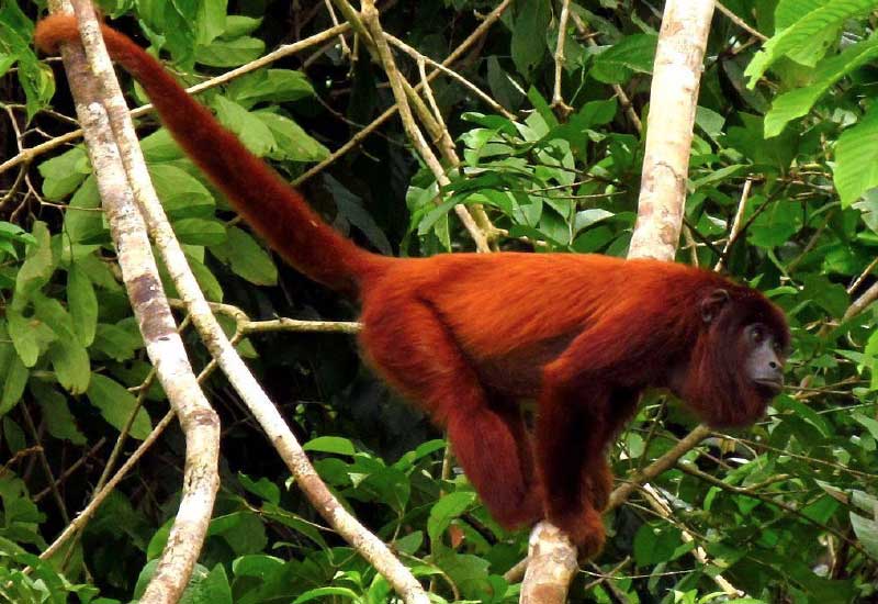 We recommend waking up before 6:00 a.m. to see monkeys and birds around the lodge. After breakfast, we will go on a 3- to 4-hour hike in the virgin jungle, accompanied by explanations from our naturalist guide. The highlight of the tour is a visit to a giant Ceiba Pentandra tree... Before the end of the day, we will go to a platform to observe bird species, monkeys, Arapaima Gigas fish... Optional night walk.